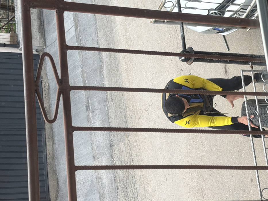 An overhead photograph taken from a raised position in Rudartsi, Bulgaria, depicts a male individual interacting with a vehicle tire on a paved surface. The image is framed by a rusty, dark brown metal railing in the foreground, featuring vertical bars and a decorative, loop-shaped element in the upper center. The subject is a male with dark, short hair, observed from behind, bending forward. He wears a long-sleeved garment with prominent yellow sleeves and upper body sections, black lower body sections, and a brown/tan and blue tactical vest or chest rig. His left hand is positioned on a dark-colored vehicle tire, which has visible tread patterns. His right hand is open, positioned near the tire. In the mid-ground, a white vehicle, identifiable as a Volkswagen by its emblem, is partially visible on the right side behind the railing, showing a license plate with characters including "B" and "K". The ground is a light grey paved surface, likely asphalt or concrete, exhibiting some wear. In the background, a dark grey, horizontally ribbed metal gate or garage door is visible, bordered by a concrete curb. A small section of green foliage and a white fence are partially visible on the far right.
