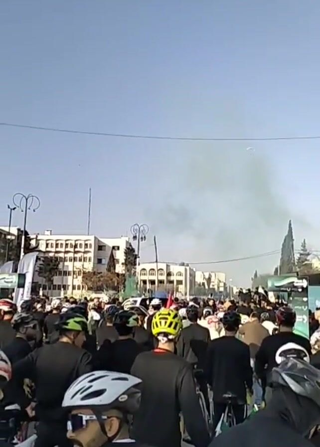 A large group of people, many wearing helmets, are gathered on a street in what appears to be a city. A paraglider is visible in the sky. Green smoke or haze drifts in the air above the crowd. Buildings line the street in the background, and there are streetlights and a tall antenna. The crowd appears to be facing in the same direction. Some people are holding flags. The sky is a clear blue.