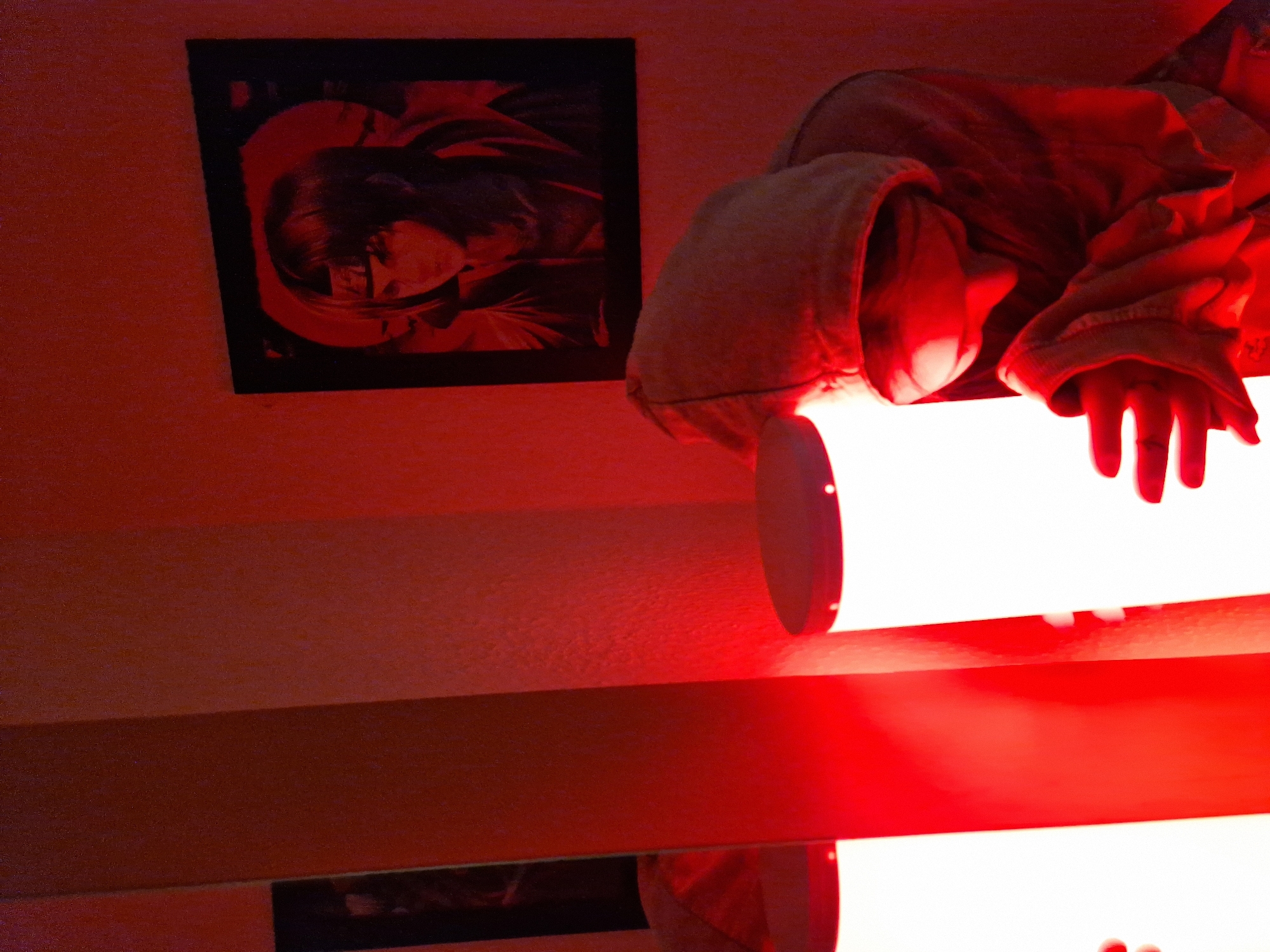 This image depicts an indoor scene within a room in Leidersbach, Germany, characterized by prominent red lighting. A person is present in the lower right quadrant of the frame, their face obscured by a hood pulled over their head. They are wearing a light-colored, possibly beige or light grey, hooded garment. The individual's right hand is extended towards a vertical, white-glowing cylindrical lamp, with fingers slightly splayed and illuminated by the lamp's light. A second identical cylindrical lamp, also emitting white light, is partially visible on the far left, reflected in a vertical surface that appears to be a mirror. The white light from these lamps interacts with the room's dominant red ambiance, causing surfaces and reflections to appear red-toned. Mounted on the textured wall in the upper right is a framed poster with a dark border. The poster displays an illustration of an individual with dark hair and a headband, consistent with an anime character, set against a large red circular background. The walls of the room are a uniform reddish color. No specific actions beyond the person's hand near the lamp, or interactions between individuals, are discernible.