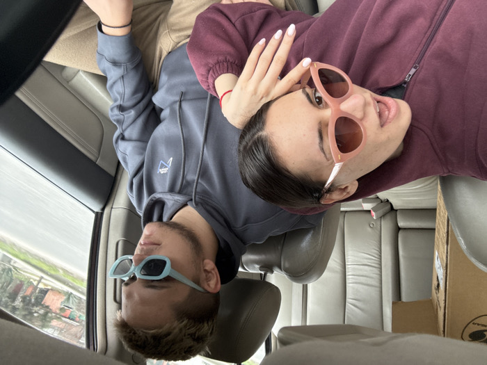 The image displays two individuals inside a vehicle's cabin, viewed from an internal perspective. A female subject is positioned in the foreground on the left, her head tilted right and resting her chin on her right hand. She has dark hair, wears light pink-framed sunglasses, a maroon zipped hoodie, and a red string bracelet on her left wrist. White nail polish is visible on her fingers, and her mouth is slightly open. To her right and slightly behind, a male subject occupies what appears to be the driver's seat, looking out the right passenger window. He has short, light-colored hair, wears light blue-framed rectangular sunglasses, a dark grey hooded sweatshirt with a white logo, khaki pants, and a black string bracelet on his left wrist. The vehicle interior features light-colored seating surfaces. A brown cardboard box labeled "COUGAR" is present in the rear passenger compartment. The exterior visible through the right window shows a blurred road, vegetation, and indistinct structures, indicative of movement. No specific landmarks within the image allow for the precise identification of the location in Orizari, Bulgaria.
