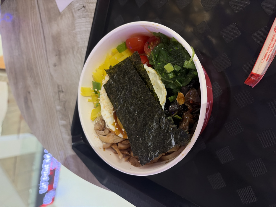 An overhead, slightly angled shot depicts a prepared dish resting on a black, textured plastic serving tray, positioned on a light-colored, wood-grain patterned table. The scene is consistent with an indoor food court or casual restaurant setting in Rostov-on-Don, Russia, indicated by Cyrillic text on a chopstick wrapper and reflected signage. The central subject is a white disposable bowl with a red band at its base, filled with a mixed meal. Contents include: - Sliced, light brown protein, possibly chicken or mushrooms, coated in a dark, glossy sauce, situated on the left side. - A fried egg with a visible yolk and crispy white edges, sprinkled with white sesame seeds, positioned slightly off-center. - A large, rectangular sheet of dark green nori (seaweed) covering a significant portion of the egg and other ingredients. - Bright yellow pickled daikon radish, cut into strips, located in the upper right quadrant. - Halved red cherry tomatoes positioned below the yellow daikon. - Dark green, possibly wakame seaweed salad, located to the right of the bowl's center. - Chopped green onions or chives, mixed with the seaweed salad. - Darker, possibly marinated vegetable or mushroom pieces towards the lower left. To the lower right of the tray, a pair of wooden chopsticks, still sealed in a red plastic wrapper, is visible. The wrapper features Cyrillic text, partially readable as "1. Первую палочку крепко зажать под большим пальцем..." (1. Firmly grasp the first chopstick under your thumb...). In the blurred background, to the upper left, bright red illuminated Cyrillic letters are reflected on a smooth surface, appearing to spell out "Суши-Сет" (Sushi-Set), a common restaurant chain in Russia. No individuals are present in the image.