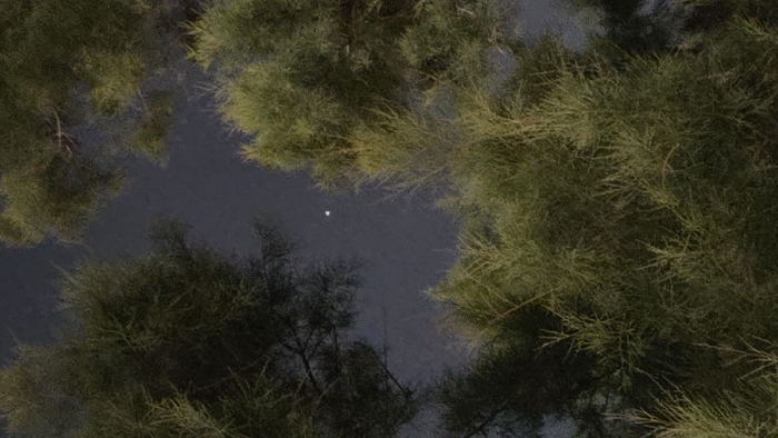 The image depicts an upward view into a dark blue-gray sky, likely at dusk or night, from Raanana, Israel. The sky occupies the central background, framed by dense tree foliage from the foreground and sides. A single, distinct, bright white circular object, consistent with a celestial body such as the moon, is visible in the upper-central portion of the sky. The tree foliage appears to be composed of numerous fine, narrow, and dense green leaves, indicative of coniferous or similar evergreen trees. No human figures or man-made structures are present within the frame.