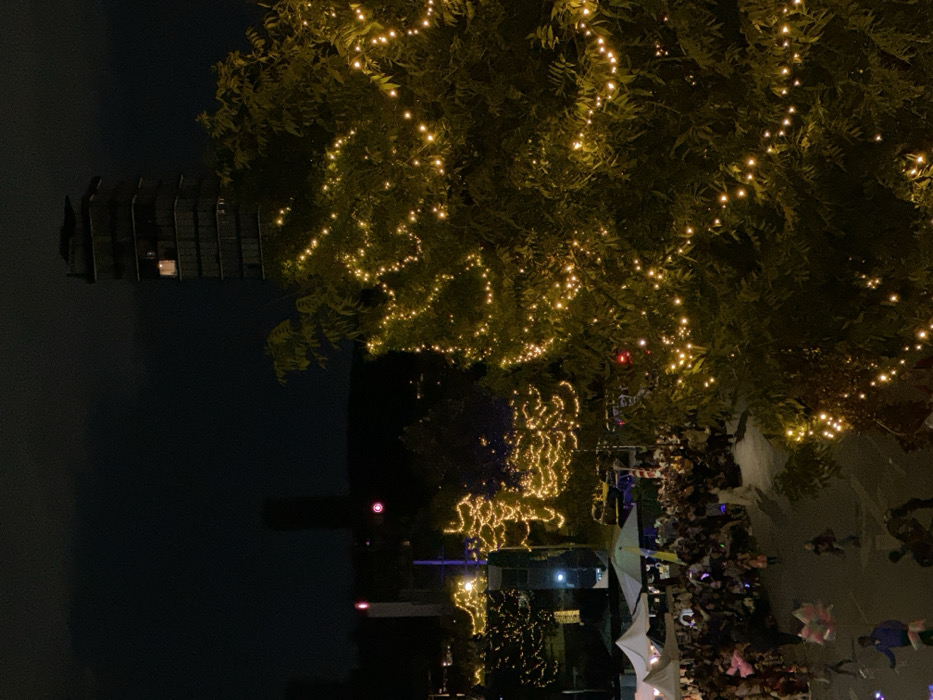 A nighttime scene featuring a tree adorned with numerous small, warm-toned lights. In the distance, a tall, dark building is visible. Below the illuminated tree, a crowd of people gathers, suggesting an event or celebration. Additional trees with similar lighting decorations add to the festive atmosphere. The scene is shot from a low angle, enhancing the height of the trees and the building in the background.