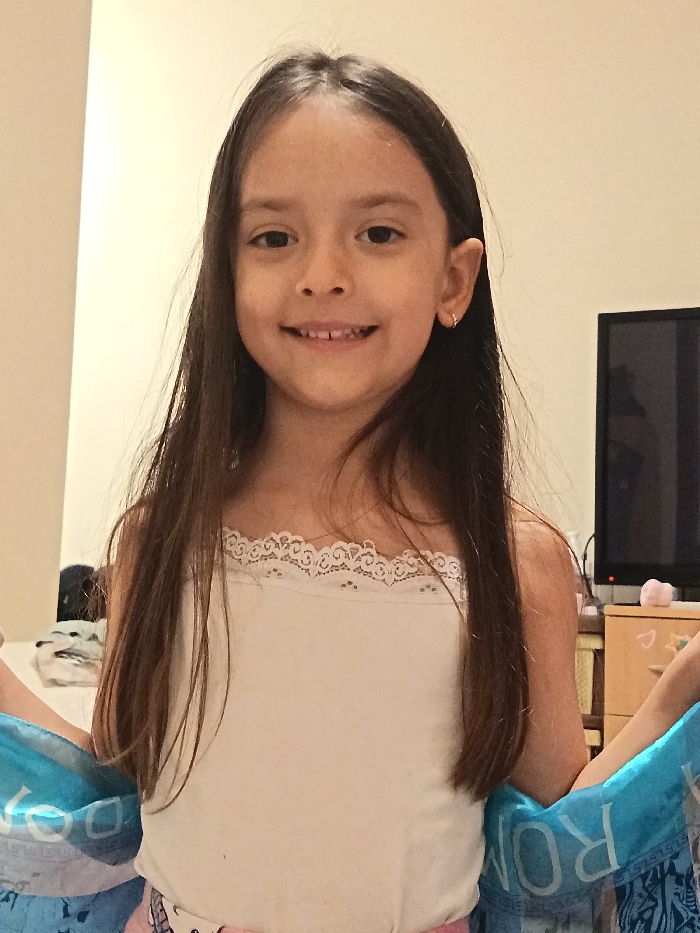 A young female child is depicted in a waist-up portrait shot indoors. She possesses long, straight, dark brown hair parted centrally and light skin. Her face is directed towards the camera, showing a smile that reveals her upper teeth and a notable gap between the two central incisors. A small hoop earring is visible in her right ear. She is dressed in a white camisole top featuring a white lace trim along the neckline. A fragment of pink fabric is visible below the camisole. Both of her hands are positioned at her sides, holding a blue patterned fabric item, which partially displays the letters "ROM". The background consists of light-colored, presumably off-white or beige, walls. To the subject's right, a dark flat-screen television is partially visible, positioned above a light-colored wooden furniture piece. A small, light pink, spherical object rests on this furniture. A section of a white upholstered item, likely a bed or sofa, is discernible behind her left shoulder. The scene is illuminated by soft, even lighting. The precise location within the city of Varna, Bulgaria, cannot be determined from the visual information presented in this image.