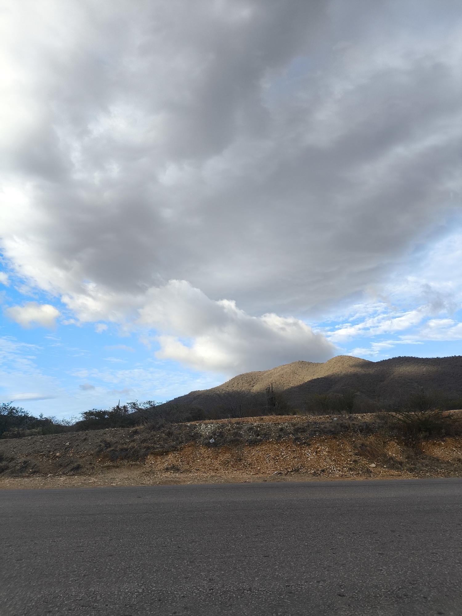 The image depicts a road in La Guardia, Venezuela. A gray asphalt road occupies the foreground. Behind the road is a raised berm of reddish-brown soil. Sparse vegetation, including shrubs and cacti, covers the hillside rising behind the berm. Two low, dry mountains form the backdrop, one in sunlight and one partially in shadow. Above the mountains, the sky is partially filled with large, gray and white clouds, with patches of blue sky visible between the clouds. There are no people visible in the scene.