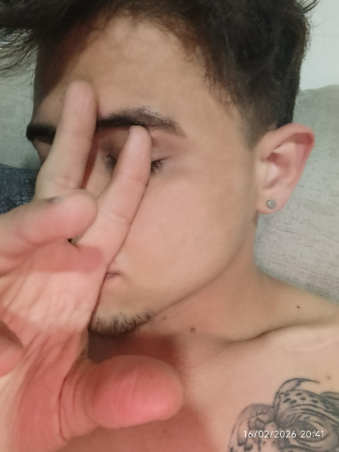 A young man is partially obscured by his hand in a close-up shot. His dark hair is neatly styled, and he has an earring. The side of his face is visible, revealing stubble. A tattoo is on his upper chest. The date "16/02/2026 20:41" is visible on the bottom right.