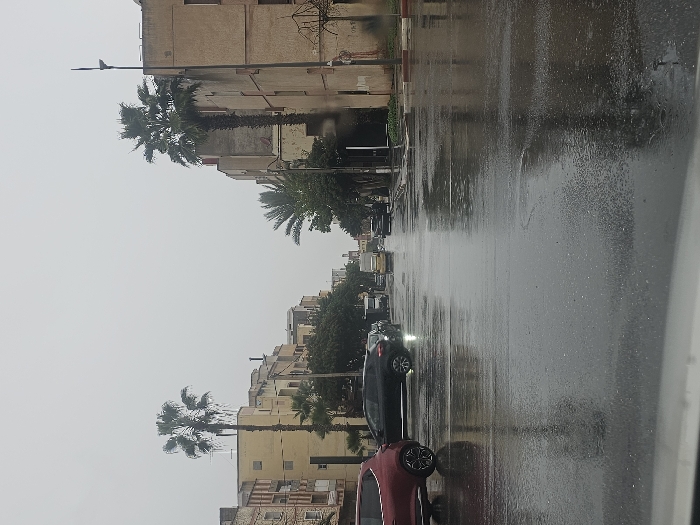 The image presents a street scene in Salé, Morocco, under an overcast sky. The asphalt road is visibly wet and reflective, indicating recent or ongoing rain. Multi-story buildings, primarily beige and light brown in color, line both sides of the thoroughfare. Numerous tall palm trees are interspersed along the street, alongside the buildings. On the immediate left, a portion of a red SUV is visible. Further down the street on the left, a black SUV is present, with its headlights illuminated. Several other vehicles are parked or in transit further down the road, including a yellow vehicle in the mid-distance. A tall, slender structure, possibly a minaret, is discernible in the far distance between the buildings. A streetlamp pole stands prominently on the right side of the road, and the curb is marked with red and white paint. No individuals are clearly visible.