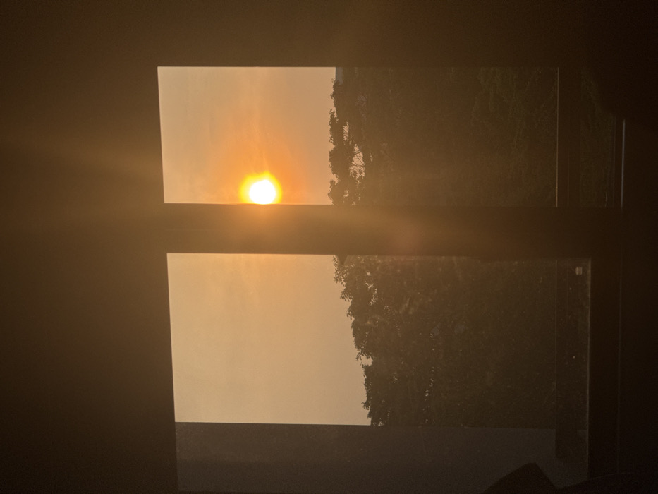 A sunny view is seen through a double-paned window. The bright sun shines on the horizon, with tree branches visible on the right side of each pane. The light is diffused, creating a warm, hazy glow. The window frame is dark, contrasting with the bright outdoor scene. The room the window is in is very dark and underexposed.