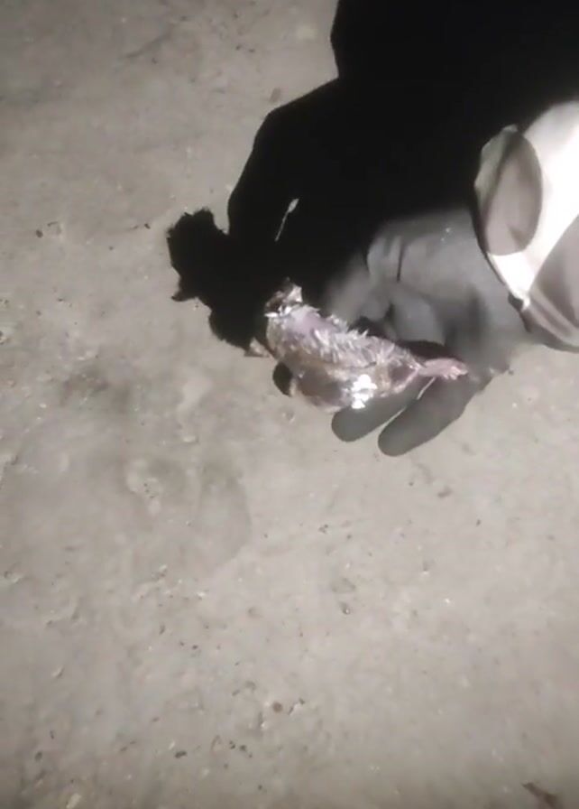 A gloved hand holds a dead mouse over a concrete floor