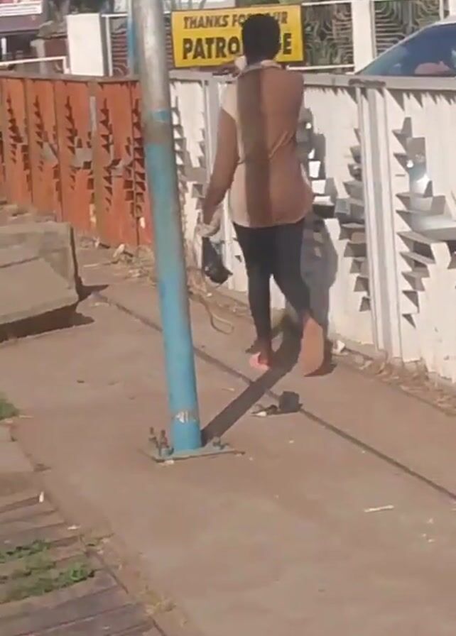 A person walks away from the camera on a sidewalk next to a fence, wearing a tan shirt, black pants, and pink flip-flops. They are carrying something dark in their left hand. There is a blue pole, concrete blocks, and some weeds on the sidewalk. A sign that reads "Thanks for your Patronage" is visible on the fence. A car horn sounds loudly.