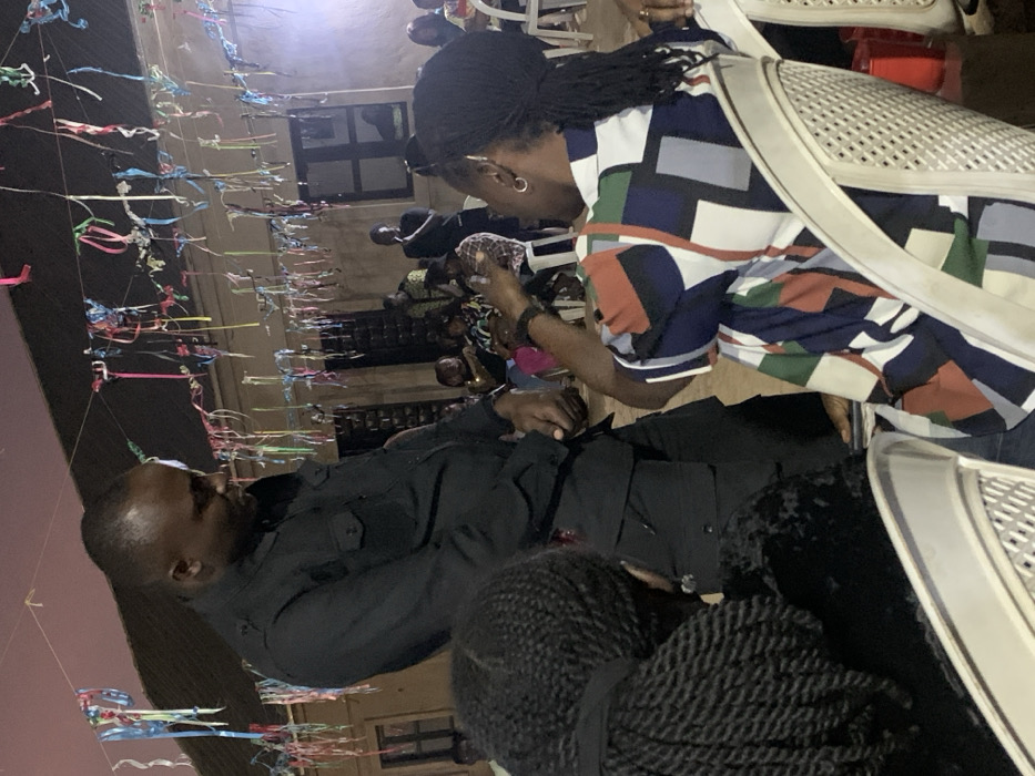 A group of people are gathered outdoors at night, with colorful streamers strung overhead. A man in a black shirt sits, talking to a person in a patterned shirt sitting beside him in a white chair. The seated man wears a watch. Other individuals are visible in the background. The setting seems festive or communal, given the decorations and gathering.