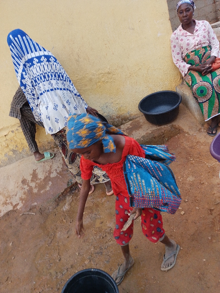 A young girl in red clothing and a blue headscarf is foregrounded. She carries a blue bag, wears sandals, and stands near a black bucket. Behind her are two women. One is covered in a blue and white cloth, and another sits against a yellow wall wearing a patterned top and green patterned skirt. A black basin sits nearby. The ground is reddish-brown.
