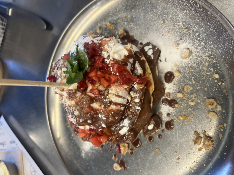- "A stacked dessert, consisting of three pancakes, is centrally presented on a circular, brushed metallic plate in Sofia, Bulgaria" by FM-Tqqde2, licensed under CC BY 4.0