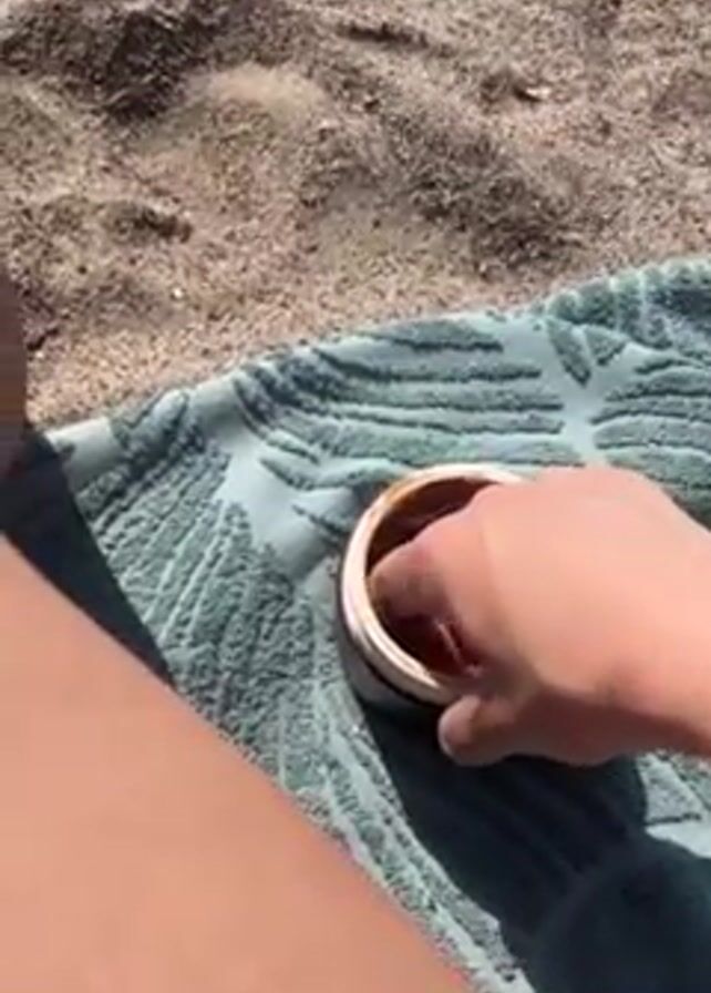 someone applying a brown paste to their leg while lying on a beach. They scoop the substance out of a small, round container and spread it over their skin. The person is lying on a light blue towel with a palm leaf pattern, and the beach sand is visible in the background. The person has a white manicure on their fingernails. Their lower leg is tan, and they are applying more paste to the top half of the leg.