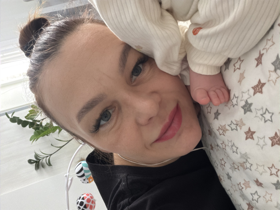 This image depicts an indoor scene in Chaikovsky, Russia, featuring an adult female and an infant. The adult female, with light-colored eyes and dark hair styled in a bun, occupies the left and central portions of the frame, smiling slightly. She has noticeable eyelashes and is wearing pink lipstick. Her upper torso is clothed in a dark garment. An infant's right foot and lower leg, clad in a light-colored, ribbed sleeper with a small orange heart emblem, are positioned against the female's face/shoulder in the lower right quadrant. Both individuals are resting on or against a white blanket or sheet patterned with small brown and grey stars. In the upper left, a white crib mobile arm extends, from which two distinct spherical toys are suspended: one featuring red, black, and white geometric patterns, and another with black, white, and yellow/orange stripes. A green-leafed houseplant is visible in the upper background, behind the mobile. The background further consists of a light-colored wall or curtain. A thin white cord, possibly from earbuds, is visible near the female's neck. The specific in-city location within Chaikovsky is not identifiable from the visual evidence.
