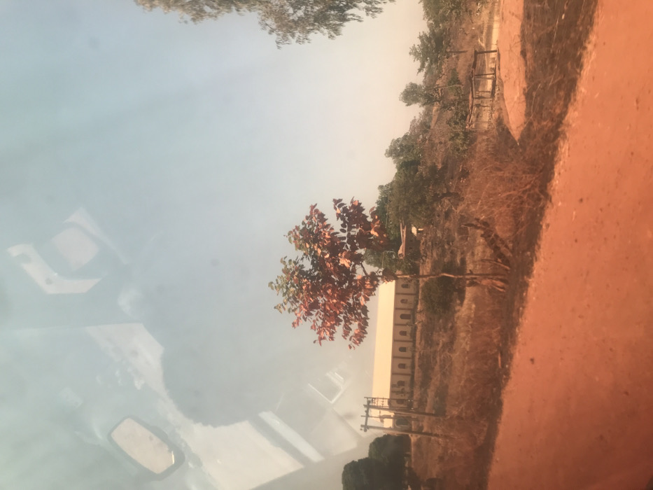 The image portrays an outdoor scene in Miango, Nigeria, viewed through a vehicle window, evidenced by reflections of a human head and an interior rearview mirror in the upper-left quadrant. A reddish-brown dirt road occupies the immediate foreground, transitioning into an undulating landscape characterized by dry, sparse vegetation and reddish-brown soil. A prominent tree with reddish-brown leaves stands centrally, slightly to the left. On an elevated slope in the middle ground, a long, light-colored building, possibly a church, featuring multiple arched windows along its visible side and a flat roof, is present. Two utility poles with wires are positioned to the left of this building. Further to the right and lower on the slope, a rudimentary open-sided shelter constructed of wood is visible. The sky above is clear, ranging from light blue to a pale, hazy hue near the horizon. No direct human or animal subjects are discernible in the outdoor environment.