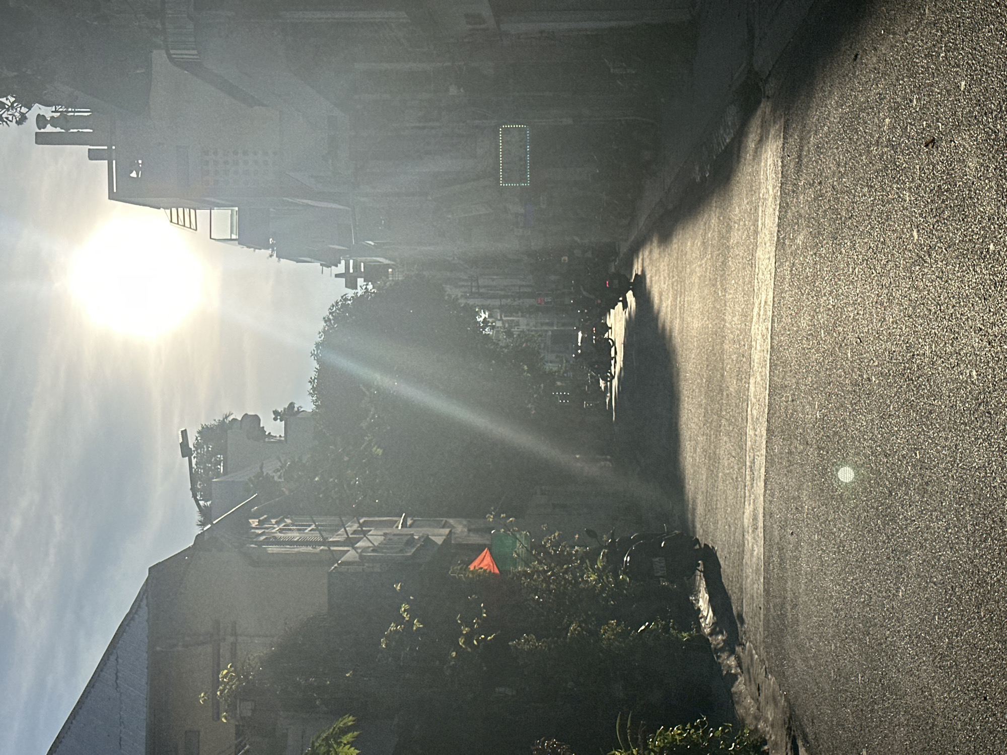 The image depicts a narrow, asphalt street in an urban area of Thủ Đức, Vietnam, under strong backlighting from a high, hazy sun. The perspective is directed down the street, with sunlight creating significant lens flare and illuminating the central roadway, contrasting with shadowed building facades and edges. On the left side, a multi-story building with a corrugated metal roof is partially visible, largely obscured by green foliage. A dark-colored scooter is parked near the curb in the foreground. Further down this side, an orange and green triangular object is observed amidst the vegetation. The right side of the street is lined with multi-story buildings. One building exhibits a light fixture extending from its upper level, and another features a rectangular, dotted light outline consistent with an unlit LED sign frame. The asphalt road surface is visible, bordered by a curb on both sides. Several motorbikes are present further down the street, appearing either parked along the sides or in transit. No human figures are distinctly visible. The lighting conditions suggest either morning or late afternoon.