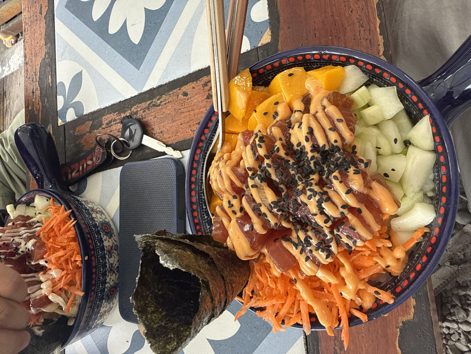 The image depicts a dining scene at an outdoor establishment in General Luna, Philippines. Two poke bowls are present on a distressed wooden table featuring light blue and white patterned tiles. In the foreground, a dark blue bowl with a handle and a red-dotted rim contains a poke preparation. The bowl holds diced raw fish (likely tuna) topped with an orange-colored sauce and black sesame seeds. Adjacent to the fish are shredded orange carrots, diced yellow mango, and diced light-green cucumber, also sprinkled with black sesame seeds. A silver fork and wooden chopsticks rest across the bowl. A cone-shaped nori (seaweed) wrap stands upright next to the bowl. In the background, a second blue and white patterned bowl, also with a handle, is visible. This bowl contains similar ingredients, including shredded carrots and lighter-colored diced items, drizzled with a white sauce and black sesame seeds. A person's hand, exhibiting light skin and a ring on the middle finger, uses chopsticks to access food from this bowl. The individual is wearing light green pants. To the left of the background bowl, a dark blue rectangular object, possibly a phone case or small electronic device, rests on the table. To the right, a set of keys is visible, including a silver Honda key attached to a keyring with a red and white lanyard. Below the table's edge, a gravel-like ground surface is discernible, along with a yellow sandal belonging to a person seated at the table.
