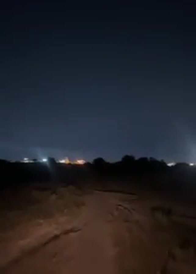 The video is taken from the perspective of someone traveling on a dirt road at night. The road is illuminated by headlights, and there are tire tracks visible in the dirt. In the distance, there are lights suggesting the presence of a city or industrial area. At one point, an electrical transmission tower is briefly visible. The sky is dark, with a few clouds occasionally visible. The overall atmosphere is dark and somewhat isolated.