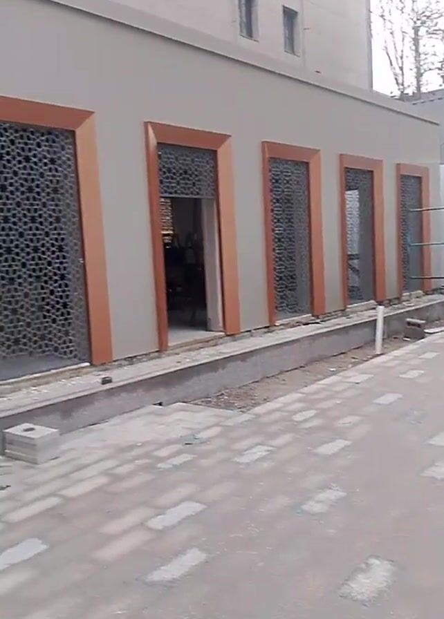 The camera pans along a low, rectangular building. The building is light grey, and has a series of openings, each framed in a matte, dark golden-brown color. Some of the openings contain patterned metal screens. Other openings are open, allowing the viewer to see into the building. Inside, we see a white door and glimpses of a dark interior. The ground is paved with grey bricks with dark spots on them. Some construction debris is scattered around, including white blocks, electrical cords, and a metal scaffold. In the background is a tall building. Above the building, a bare tree can be seen.