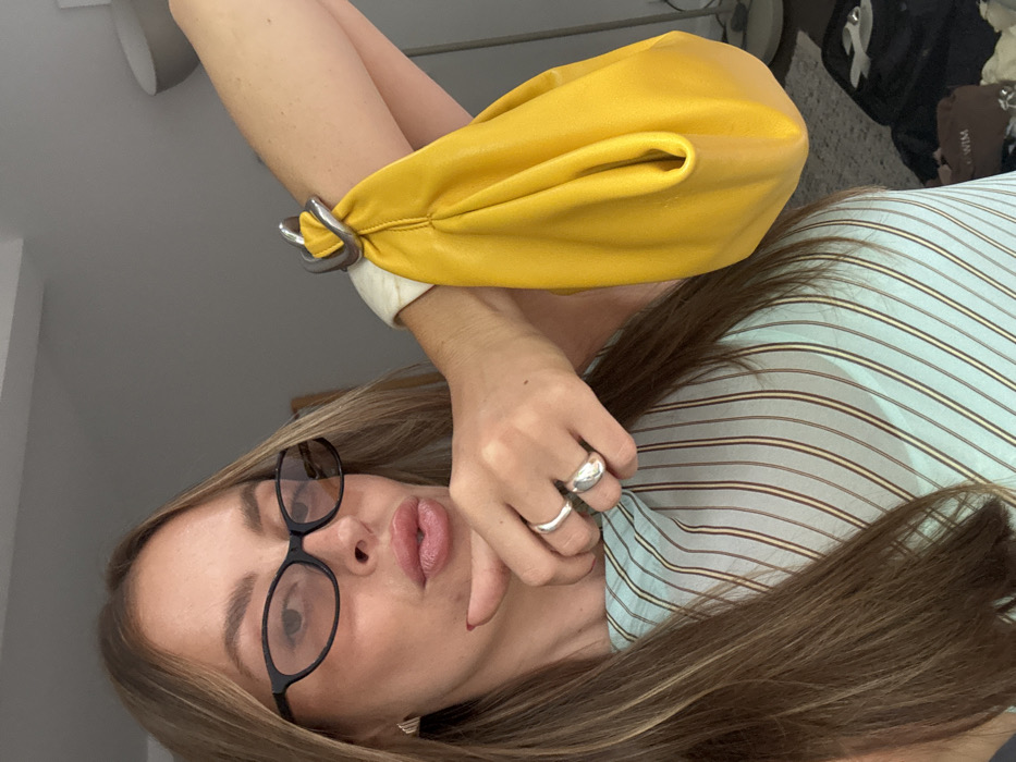 A woman with glasses poses, resting her face on her hand adorned with two silver rings. Her light brown hair cascades around her face. She wears a striped turquoise and brown shirt. A yellow leather bag with a silver buckle rests on her arm. The background includes a white wall and a glimpse of what appears to be a carpet and bag on the floor.