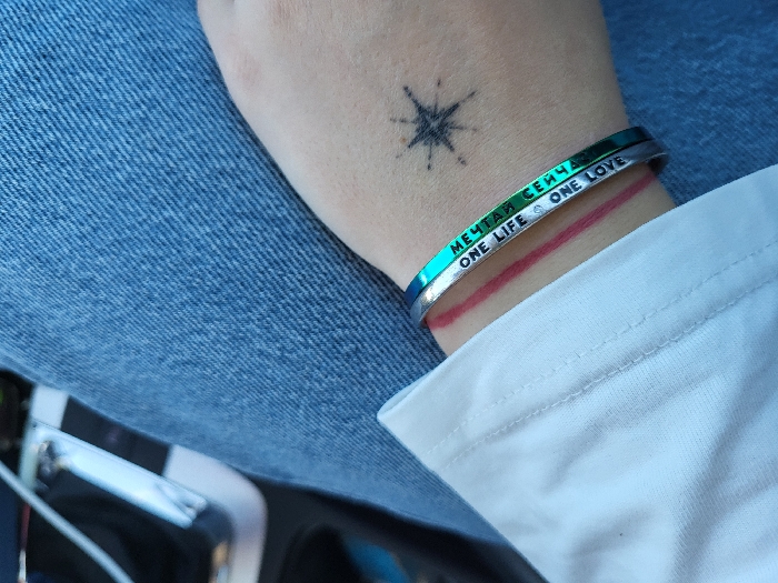 The image presents a close-up, downward perspective of a person's left forearm and hand, resting upon a thigh clad in blue denim jeans. The scene is identified as being in the city of Dub, Montenegro. A white long-sleeved shirt cuff is visible on the lower left. The wrist displays two metal cuff bracelets. The upper bracelet is iridescent with a teal-green hue, featuring engraved text: "МЕЧТАЙ СЕЙЧАС" (DREAM NOW) in Cyrillic and "ONE LIFE ONE LOVE" in English. The lower bracelet is silver-colored, also engraved with "ONE LIFE ONE LOVE". A thin red line, possibly a string bracelet or scar, is visible beneath the metal bracelets on the wrist. On the back of the hand, a black eight-pointed star or compass rose tattoo is present. The background, largely blurred, shows elements consistent with a vehicle's interior, including reflections and metallic or plastic surfaces in the upper left quadrant.