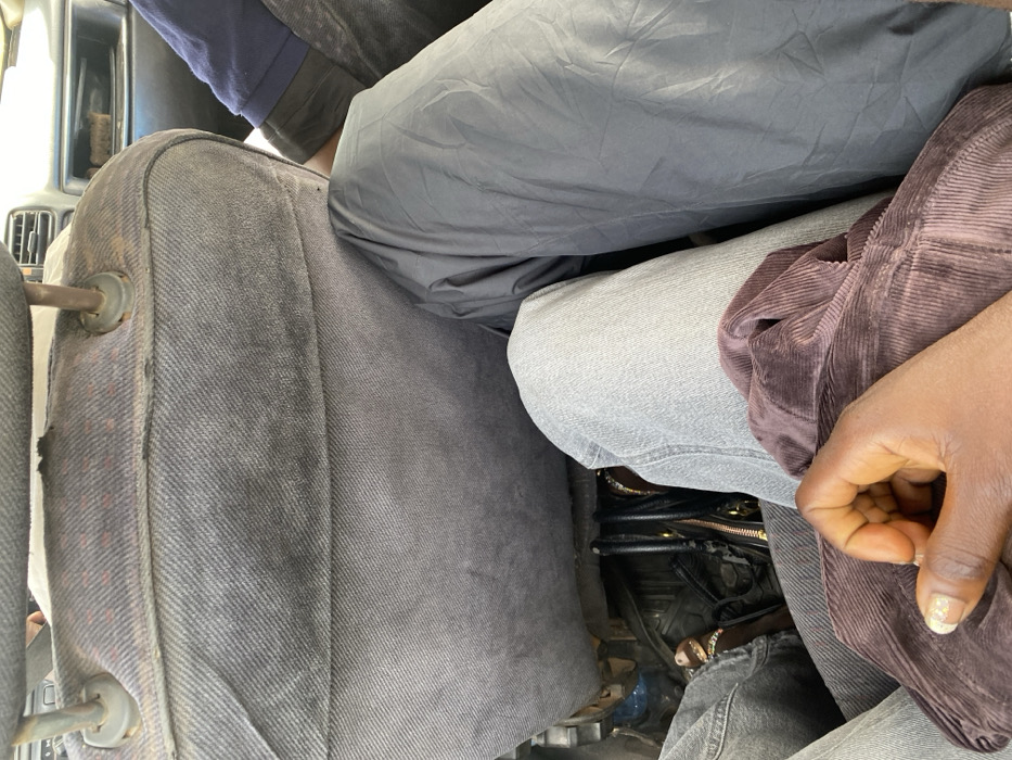 The image depicts the interior of a vehicle, viewed from a passenger's perspective in Unguwar Gaya, Nigeria