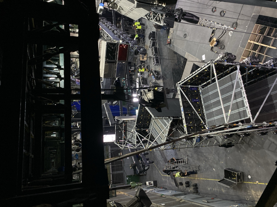 The image presents a high-angle, forensic view of a large indoor event space within the City of Cukarica Urban Municipality, Serbia, during a significant setup or teardown operation. The environment is characterized by a dark grey floor, substantial industrial infrastructure overhead, and walls, suggesting a soundstage, arena, or convention hall. Prominently featured are two large, multi-tiered aluminum truss structures, partially assembled or disassembled, occupying the central and midground. These structures exhibit exposed metal frameworks, horizontal platforms, and vertical sections partially clad with black LED video panels. Numerous professional stage lighting fixtures are mounted on these trusses and on various overhead rigging elements, which consist of a dense network of black metal beams, rails, and cables spanning the ceiling. Approximately nine individuals are visible throughout the scene, primarily engaged in various tasks. Several personnel are identifiable by their high-visibility yellow safety vests worn over dark clothing. On the left side of the image, two males are positioned near a silver ladder; one in a yellow vest stands on the floor, while the other, dressed in dark attire, is on the ladder, seemingly maneuvering a long, dark, flat object. A multi-wheeled equipment dolly is situated nearby. In the midground and extending towards the background, numerous black road cases, indicating transport and storage of technical equipment, are scattered across the floor. Several individuals, some in yellow vests, are actively engaged around these cases, suggesting equipment unpacking, packing, or organization. To the far right, a large stack of grey line array speaker units is visible. The floor in the lower right foreground appears to be a stage area, identifiable by its dark grey surfacing and visible cables. Adjacent to this area, wooden framework elements are present, potentially for stage risers or set pieces. The entire scene is illuminated by artificial light sources originating from overhead fixtures and task lighting, creating areas of both light and shadow.