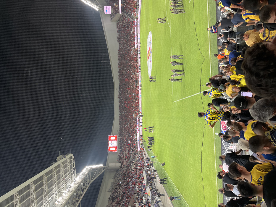 This is a nighttime, elevated view inside Bloomfield Stadium in Tel Aviv-Jaffa, Israel, depicting a football (soccer) match or event. The image is captured from a lower seating tier, looking over a black safety netting towards the green pitch and the opposing stands. The stadium is largely filled with spectators. The distant stands are dominated by a dense crowd wearing red attire, while the foreground stands are populated by numerous individuals, many wearing yellow, blue, and black team jerseys. A prominent male spectator in the immediate foreground stands with his back to the camera, wearing a yellow and black checkered jersey with the number "8" on the reverse. Other spectators around him are actively engaged, some holding smartphones. The bright green football pitch is illuminated by powerful floodlights integrated into the stadium's white, arched roof structure, partially visible on the upper left. White field markings are discernible. Scattered across the pitch are groups of individuals dressed in olive green or khaki military-style uniforms, standing in small formations, predominantly on the right side. Civilian-attired personnel are also present on the sidelines. A large digital scoreboard, framed in red, displays a "0:0" score and team logos above the distant stands. Digital advertising boards run along the perimeter of the pitch.
