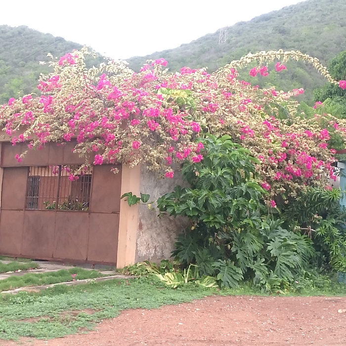 The image depicts an exterior scene in La Tagua, Venezuela. A dark brown, weathered metal gate with horizontal bars is partially visible on the left, leading to an interior space. To the right of the gate is a light peach-colored concrete pillar, connected to a grey, textured wall. A large bougainvillea plant with numerous vibrant pink flowers and variegated cream and green leaves extensively covers the top of the gate and extends over the adjacent wall. Below the bougainvillea and against the wall, a dense cluster of broad-leafed green tropical plants and other foliage is visible. The immediate foreground consists of a reddish-brown dirt path, followed by a strip of green ground cover and grass, which transitions into a concrete surface in front of the gate. No people are present. In the background, prominent green, tree-covered hills rise under an overcast sky. A metal lattice power transmission tower is discernible on one of the distant hillsides.