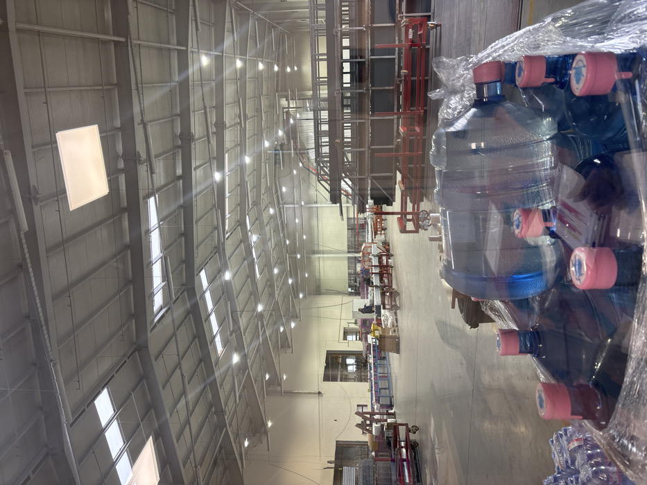 This image presents the interior of a large industrial facility or warehouse, located in Tsaratsovo, Bulgaria. The foreground shows several large, clear plastic water cooler bottles, each with a pink cap, bundled together with clear plastic wrap. Smaller individual plastic water bottles are also visible to the left. The midground features an expansive concrete floor and an active industrial environment. Various pieces of equipment are present, including multiple red and silver metal wheeled carts, long horizontal conveyor systems, and workbenches. Two individuals are discernible in the left-midground, standing near equipment and appearing to be engaged in work-related tasks. In the right-midground, a large quantity of metal profiles or beams is neatly stacked on a multi-tiered rack system. The background includes a tall, light-colored wall with large rectangular openings or windows leading to another section of the facility. The building's high, corrugated metal ceiling is equipped with numerous rectangular skylights and an array of evenly spaced square LED light fixtures, providing ample illumination to the entire space.