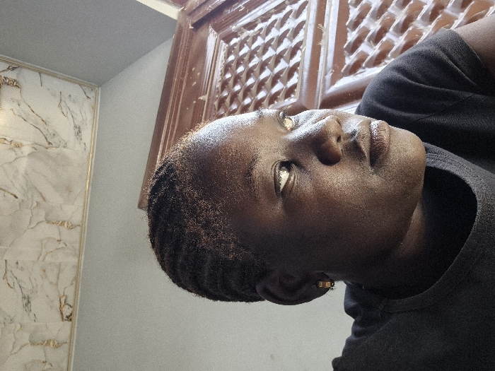A close-up portrait in Yelwa, Nigeria, shows an individual with dark skin, short cornrow-style braids featuring reddish-brown highlights, and a small gold-colored hoop earring in their visible left ear
