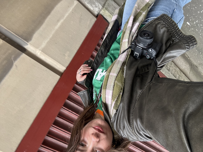 A young adult female with brown hair, a nose piercing, and a neutral expression is depicted in a selfie, partially obscured from the chest down. She wears a dark grey/brown jacket over a bright green shirt featuring partial white text, possibly "GAL". A light-colored plaid scarf with pink stripes is draped around her neck. Blue denim jeans are visible at the bottom of the frame. A black Canon EOS R-series mirrorless camera (specifically a Canon R50) with an RF-S kit lens is suspended by a black strap, resting on her left side. Her left hand, adorned with multiple silver rings and pink nail polish, is visible near her hip. The background features a red corrugated metal roller shutter on the left and a light brown building facade with a vertical dark red beam on the right. The ground is a light grey concrete or paved surface. The scene is consistent with an urban street environment within the city of Belfast, United Kingdom.