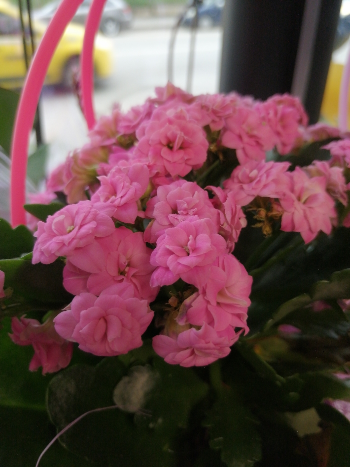 A cluster of pink Kalanchoe flowers, densely packed with multiple petals, occupies the foreground in sharp focus. Green succulent leaves are visible beneath and around the flower clusters. In the blurred background, viewed through a window, a street scene is visible. A bright pink, vertical tubular object is present on the left side. A yellow vehicle is indistinctly visible on the street, along with other blurred vehicles and urban elements. A dark, vertical structural element is partially visible on the right background. The scene depicts an indoor setting overlooking an urban street. No people are visible. No actions or interactions are depicted. The location is in the city of Unknown, Unknown.