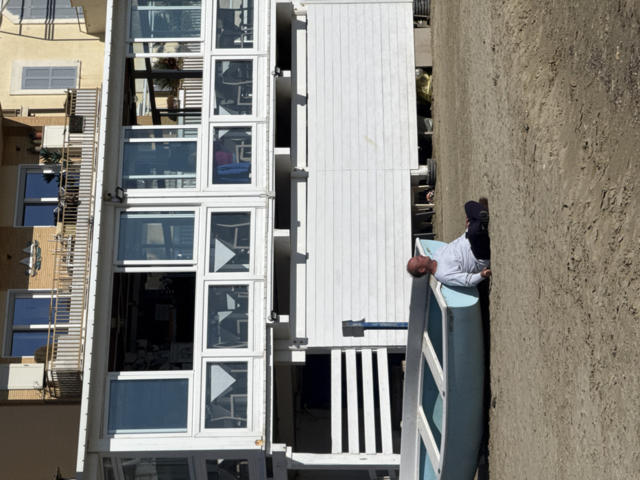 This image depicts a coastal scene in Anzio, Italy, featuring a male individual and architectural structures on a sandy beach. In the foreground, a middle-aged male, balding and wearing a white long-sleeved shirt and dark trousers, sits directly on the coarse sand. He is leaning against the light blue hull of an overturned or beached boat, which rests on its side. The man's head is tilted upwards and to the right, suggesting he is looking towards the sky or an unseen element outside the frame. His arms are positioned neutrally, with his hands near his knees. Behind the man and boat stands a multi-level white structure, likely a restaurant or beach club. Its upper level features an enclosed dining area with numerous large glass windows and white frames. Visible inside are tables draped with white tablecloths and accompanying chairs. The lower section of this white building consists of horizontal wooden siding, with a section of white horizontal slats forming an open-ended enclosure to the left. A slender blue pole is visible immediately to the right of this slatted section, extending vertically from the sand. Underneath the main white structure, various dark objects, including what appears to be a tire, are partially obscured. In the background, positioned above and behind the white building, is a multi-story building with a light brown or tan facade. This building features balconies with railings; one balcony on the mid-level displays a decorative white boat sculpture and what appears to be potted plants. Another section to the far right shows a window with closed gray shutters. The scene is brightly illuminated, indicating daylight conditions with clear reflections visible in the glass windows of the white building.
