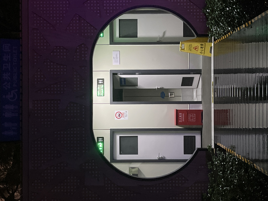 - "An exterior nighttime view in Yanqiao, China, depicts a public toilet facility enclosed within a dark, decorative archway featuring a circular opening" by FM-vtSbX2, licensed under CC BY 4.0