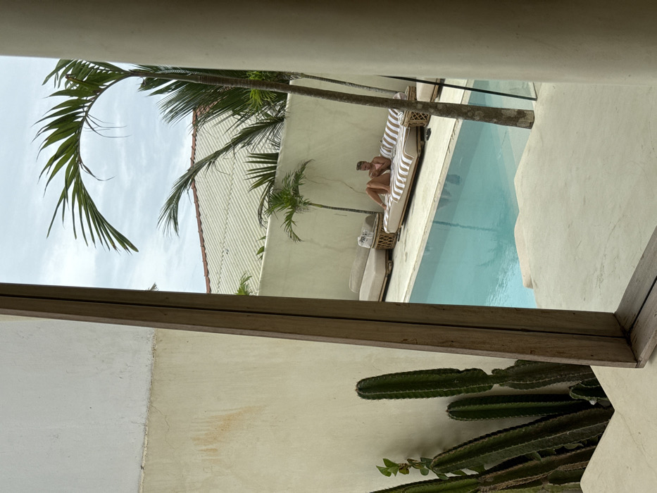 A partial view through a window reveals a luxury outdoor space. A figure is reclining on a striped daybed beside a pool. The area is landscaped with palm trees and cacti, set against white walls and a corrugated roof. The foreground consists of the window frame and a portion of the building's exterior.