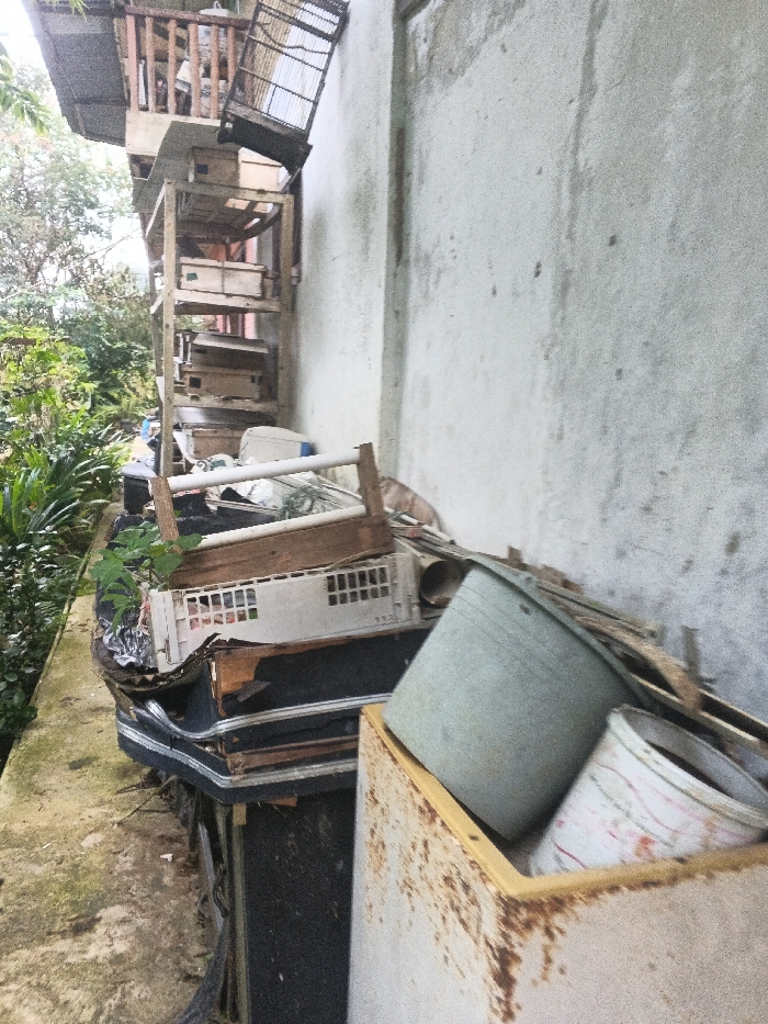 The scene depicts an outdoor alleyway or side yard in Unknown, Vietnam, positioned adjacent to a weathered, light-colored concrete wall exhibiting dark stains and mildew. The ground consists of a stained concrete or paved surface. To the left, dense green tropical vegetation is visible. An elevated, multi-tiered wooden structure, consistent with shelving or animal housing, is positioned against the upper-left section of the wall. This structure contains multiple rectangular wooden boxes or enclosures on its various tiers. A black wire cage is affixed to the top of this structure, angled downwards. A blurry, indistinct figure, potentially humanoid or a large animal, is partially visible on the structure's uppermost level. The mid-ground and foreground are heavily cluttered with an accumulation of discarded items. These include a broken, dark-colored object resembling a vehicle bumper or panel, topped with a light-colored plastic crate featuring rectangular perforations, and a white appliance unit, possibly an air conditioner. Various pieces of scrap wood, metal, and plastic, along with a segment of white PVC pipe, are scattered throughout the debris pile. A small plant is observed growing from the accumulated refuse in the lower-left. In the lower-right foreground, a tilted light grey-green plastic bucket rests within a rusty, open-top metal container, consistent with a refrigerator or freezer shell. A smaller white bucket with red stripes is partially visible beside the larger bucket. A brown domestic cat is present amidst the debris, positioned against the wall in the mid-right, appearing stationary.