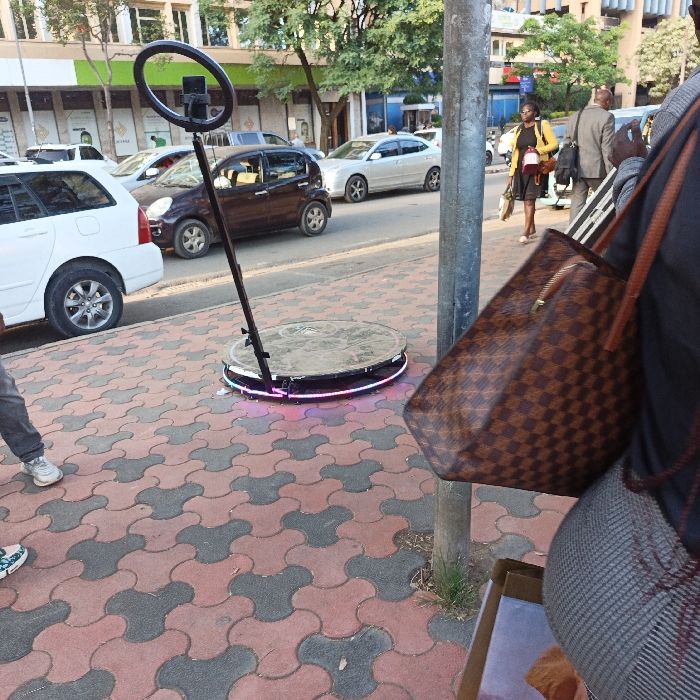 This image depicts a daytime urban street scene in Nairobi, Kenya. A 360-degree photo booth, consisting of a circular platform with multi-colored LED lights on its perimeter and an upward-angled arm supporting a ring light and phone holder, is positioned on a red and black interlocking paver sidewalk. A partial view of a person's lower left leg, wearing grey trousers and a white athletic shoe, is visible on the far left. The right side of another individual, carrying a brown checkered shoulder bag and dressed in dark clothing, is partially obscured by a grey utility pole in the immediate foreground. In the mid-ground, a woman in a yellow top and dark skirt, carrying a light handbag, walks leftward on the sidewalk, followed by a man in a light suit jacket and dark trousers with a dark shoulder bag. The adjacent asphalt road contains parked and moving vehicles, including a white SUV, a dark maroon hatchback, and a silver sedan. Multi-story commercial buildings with green architectural details and mature trees line the street in the background.
