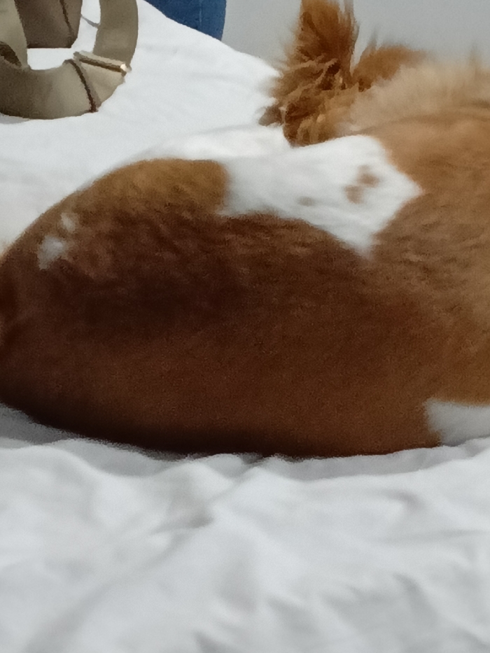 - "The scene, located in Monterey Park, United States of America, depicts a domestic mammal with reddish-brown and white fur, resting on a white textile surface" by FM-7Rq8C3, licensed under CC BY 4.0
