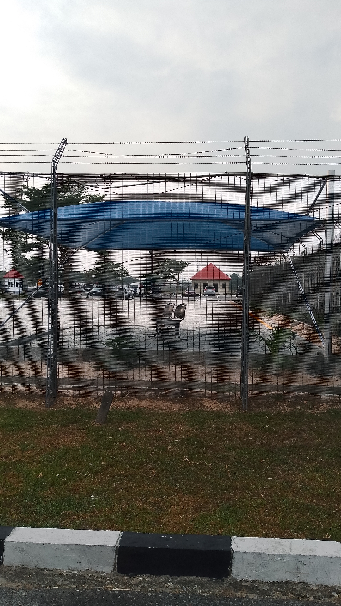 The image displays an outdoor scene in Orerokpe, Nigeria. In the immediate foreground, a concrete curb painted black and white borders a patch of green and brown grass. A tall, dark grey mesh security fence, topped with multiple strands of barbed wire, extends across the midground. Behind this fence, a large, rectangular blue fabric shade canopy covers a light grey paved area. Underneath the canopy, two dark-colored, unoccupied public seating benches are centrally positioned. The paved area, functioning as a parking lot, contains several parked vehicles, including cars and vans, visible in the background. Two small buildings with distinct red pyramidal roofs are situated at the far left and right edges of the paved area. Sparse trees and green foliage are scattered throughout the scene. The sky is uniformly overcast and light grey. No individuals are present or visible within the frame.