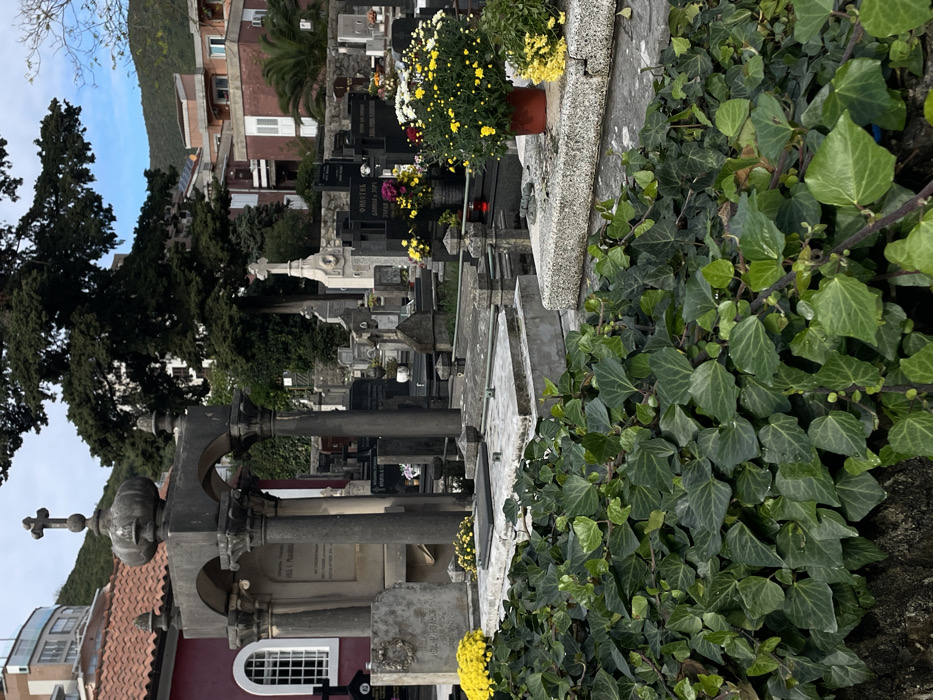 This image depicts a cemetery scene, specifically identified as the Old Town Cemetery in Budva, Montenegro