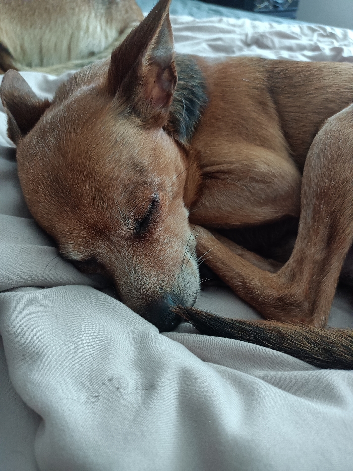 - "A reddish-brown dog is observed sleeping in a curled position on a light-colored, possibly beige or light grey, textile surface, within a residence in Chernovrah, Bulgaria" by FM-0CvF33, licensed under CC BY 4.0
