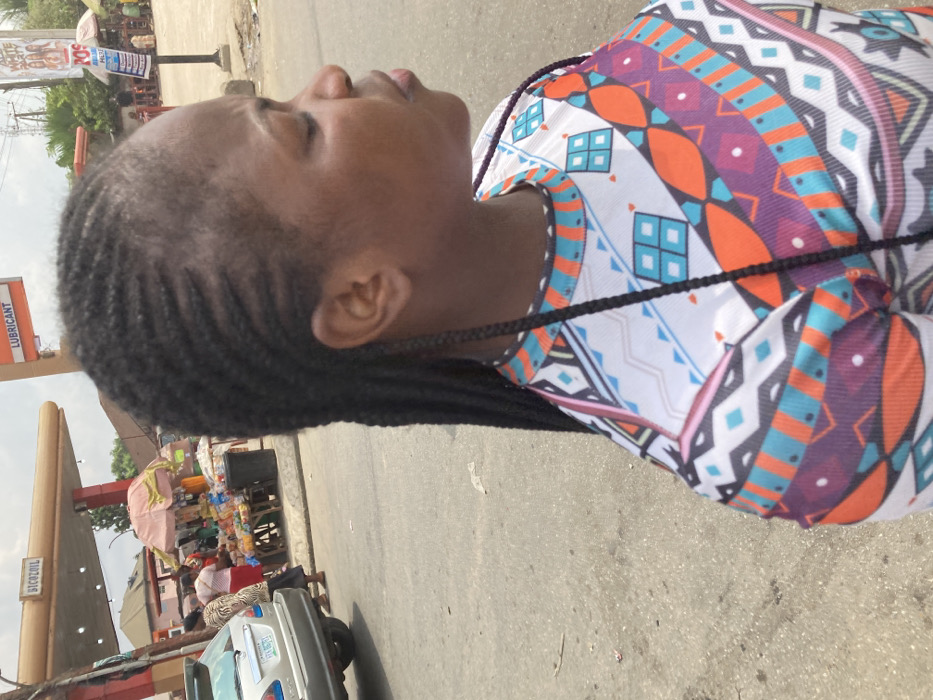 The image depicts an outdoor scene in Ura Nta Umuarandu, Nigeria, focusing on the right profile of an individual in the foreground. This individual, appearing to be an adult female, has a darker complexion, black cornrow braids on the scalp, and longer black box braids extending down the back and side. She is wearing a long-sleeved top featuring a complex geometric pattern in white, orange, turquoise, purple, and black. Her eyes are closed or heavily lidded, and her lips are slightly parted. In the mid-ground, a paved road surface occupies the lower-left quadrant. The rear of a light-colored Lexus SUV with a Nigerian license plate (FFK-875YY) is visible, partially obscuring other individuals. Behind the vehicle, a bustling open-air market is visible, featuring several people, primarily women, and stalls laden with various packaged goods under a large, light-colored umbrella. Further in the background, a BICOZIL gas station canopy is prominent, with an orange sign indicating "LUBRICANT." A white banner on a pole, partially readable, mentions "ALL WHITE PARTY" and "POS." Residential and commercial buildings line the street, interspersed with some vegetation. The sky is bright but appears overcast. The overall environment suggests a busy urban street or market area during daytime.