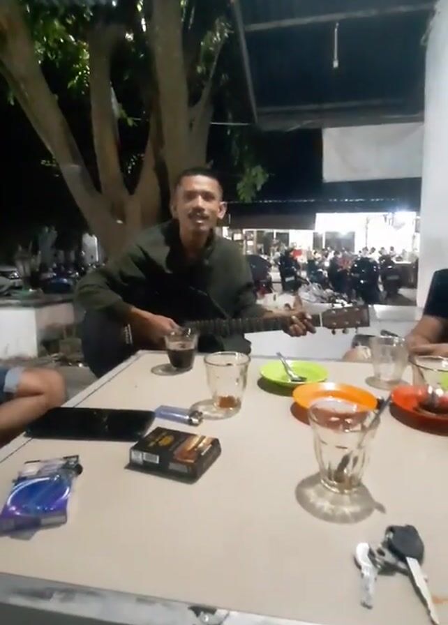 A man wearing a green long-sleeved shirt is sitting at a table outdoors, playing an acoustic guitar and smiling. Other people are partially visible at the table with him, but they are obscured. On the table are several half-empty glasses, a pack of cigarettes, a cell phone, a lighter, a set of keys, and small plates with leftover food. The setting appears to be an outdoor café or gathering place at night. In the background, there is a crowd of people and parked motorcycles are visible. The roof above the table is made of corrugated metal. A tree is behind the man playing guitar. The overall lighting is dim, typical of a night scene.