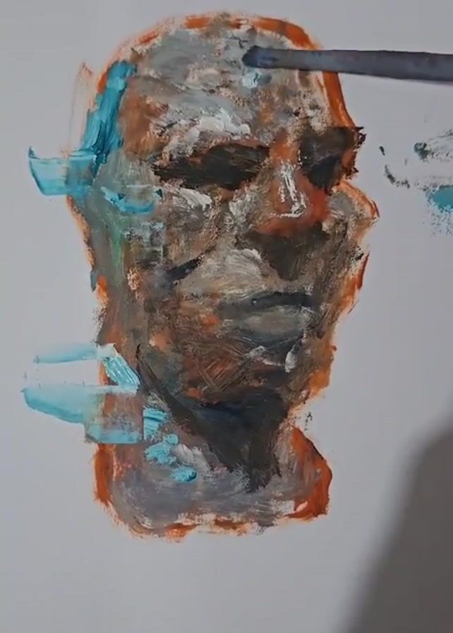 n unfinished portrait being painted on a white sheet of paper. A painting utensil is visible at the top, and is moving as it is used to paint the head of the subject. The painting is mostly brown, gray, and orange with dashes of light blue. The portrait seems to be a bald, dark-skinned person. The surface underneath the white paper is brown.