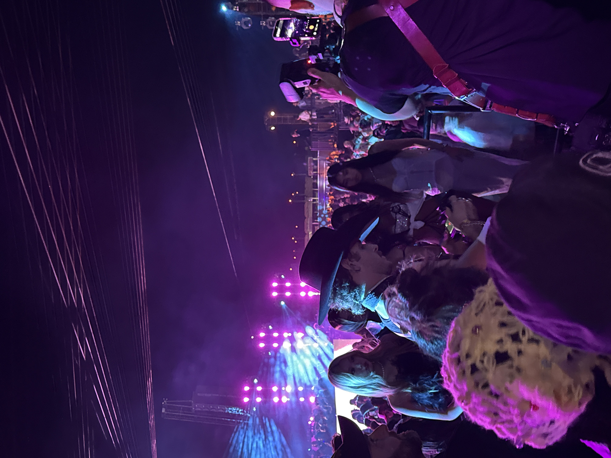 crowd of people at a concert or event in Thermal, California. Stage lights illuminate the crowd in shades of purple and blue. Several rows of rigging hang above the audience. Several people are visible in the crowd, including one wearing a black cowboy hat. Some are holding up their phones, taking pictures. A photographer with a professional camera is also present.