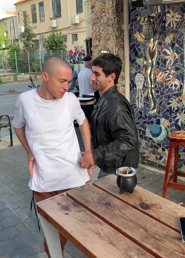 Outside a café on a bright day, two men stand near a wooden picnic table. The man on the left, with a shaved head, wears a white t-shirt and brown pants. He turns around to embrace the second man, dressed in a black leather jacket. The first man puts his arm around the second man’s waist while holding a black helmet in his other hand. He then points upwards with his right hand. A young woman, also in a black leather jacket and wearing sunglasses, approaches the table and points in the same direction as the first man. The café behind them has colorful mosaic decorations and a blue awning. A bottle of water and a small metal pot sit on the table. A cyclist rides by in the street, along with a parked scooter.