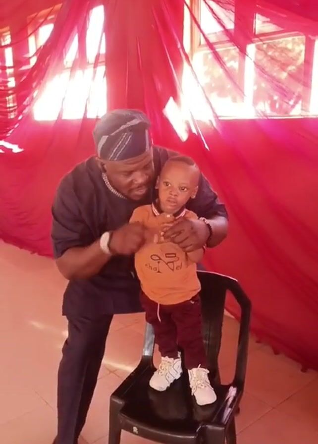 A man and a child are in a room decorated with red curtains. The man is wearing a dark shirt and pants with a patterned cap, while the child is dressed in an orange polo shirt, maroon pants, and white shoes. The child stands on a black plastic chair, held by the man. The man is dancing, and at one point, he gestures with his finger. The room is brightly lit, with light filtering through the red curtains. The floor is tiled. The camera moves slightly during the video. The man's face is mostly visible and animated.