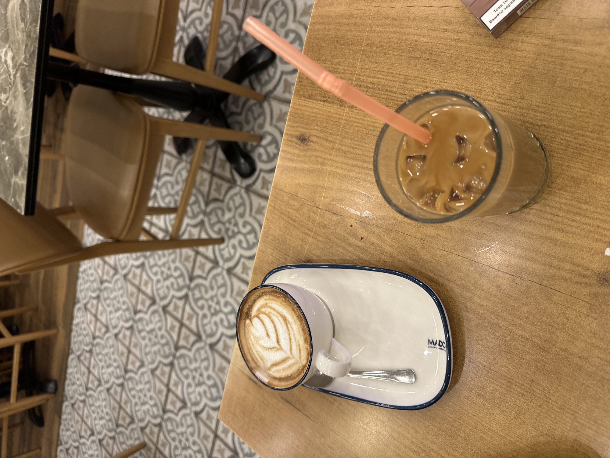 The scene depicts a tabletop view within a cafe in Beyoğlu, Turkey. A light-colored wooden table occupies the foreground. On the left, a white ceramic cup containing a cappuccino with a distinct leaf-patterned latte art rests on an elongated white saucer with a dark blue rim. A small silver spoon is placed on the saucer, which bears the "MADO" brand logo. To the right, a clear glass holds an iced coffee containing several ice cubes and a light brown liquid, with an orange plastic straw inserted. A partially visible brown cigarette packet, displaying non-English text, lies on the far right edge of the table. The background is out of focus, revealing a floor tiled with intricate grey, beige, and dark grey geometric and floral patterns, along with several light-colored wooden chairs featuring padded seats and a dark-topped table with a black pedestal base. No individuals are visible.